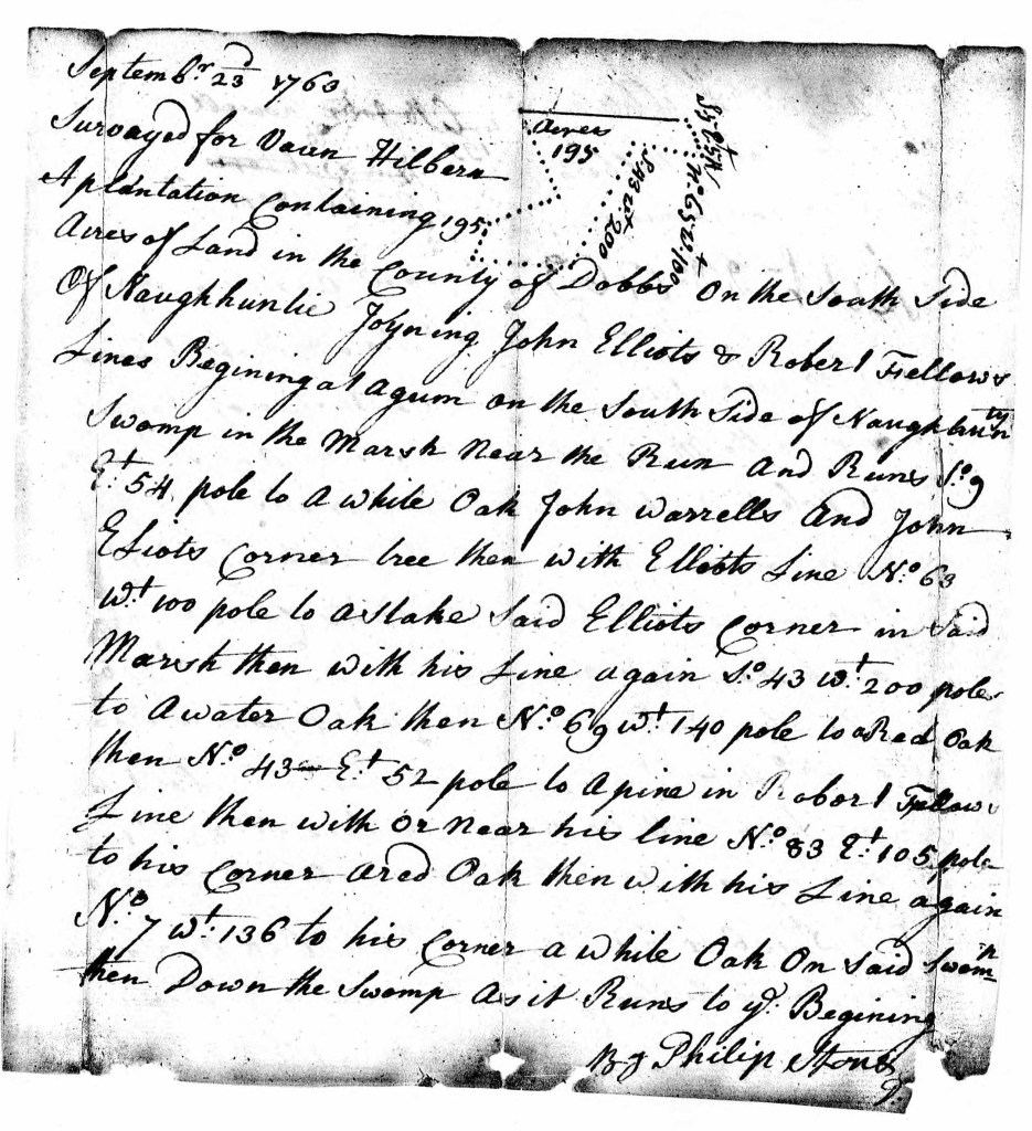 On 23 Sep 1763 a patent was entered in Dobbs County, North Carolina for a 195 acre survey for Vaun Hilbern on the south side of Naughhunty (also spelled Nauhunty in another record for him). This land joined John Elliot and Robert Fellow’s lines and ran south to John Worrell and John Elliot’s corner. The chain bearers were John Rowell and Rich’d Worrell. This grant #66 was issued on December 21, 1763 & found in Book 8, p. 7.