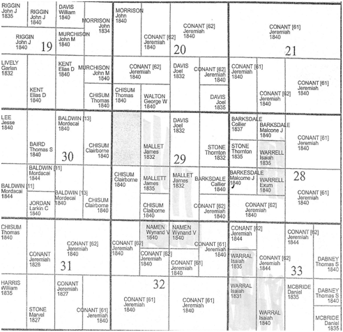 Isaiah Worrell had land in sections 28 and 33, Exum Warrel had land in section 28, while Van Namen had 40 acres in Section 32. At the time Vaughan Hilburn died, Isaiah Worrell owned land in Section 33. These sections are slightly shaded for the purpose of identification.