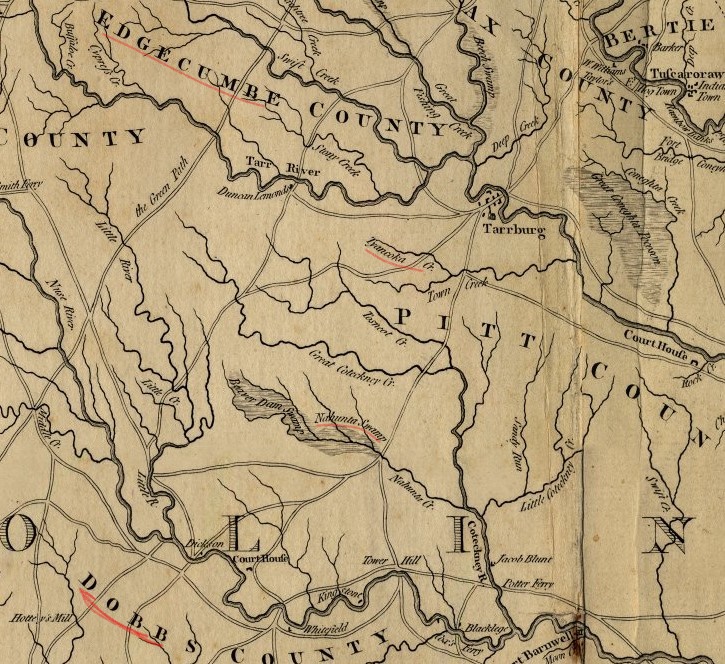 Both John Hilburn and Vaun Hilburn were in Edgecombe; Vaun #1 was there as early as 1748 and again in 1763 (Vaughan #1 or #2?) while John Hilburn was there in 1753. The distance between Tyancoky, now referred to as Cokey Swamp, and Nahunta (35.5126605, -77.7324773) is approximately 20 miles.