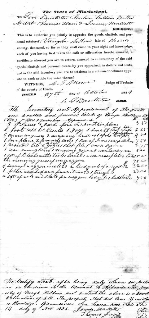 This will was actually recorded in October, almost two months after Vaughan’s death and was based upon the testimony of a friend or neighbor in Hinds County. Vaughan Hilburn must have been living in Hinds County, MS at the time of his death. According to land records of persons named in the will, he was living in southern part of the couty which borders Copiah County, where his sons John & Frederick Hilburn owned land. Although only John Hilburn owned land by this date and his land was in Township 10, Range 8E in Section 14. At the end of 1834, Frederick Hilburn and John Hilburn, Jr. also bought land in the same township and range as John Sr.