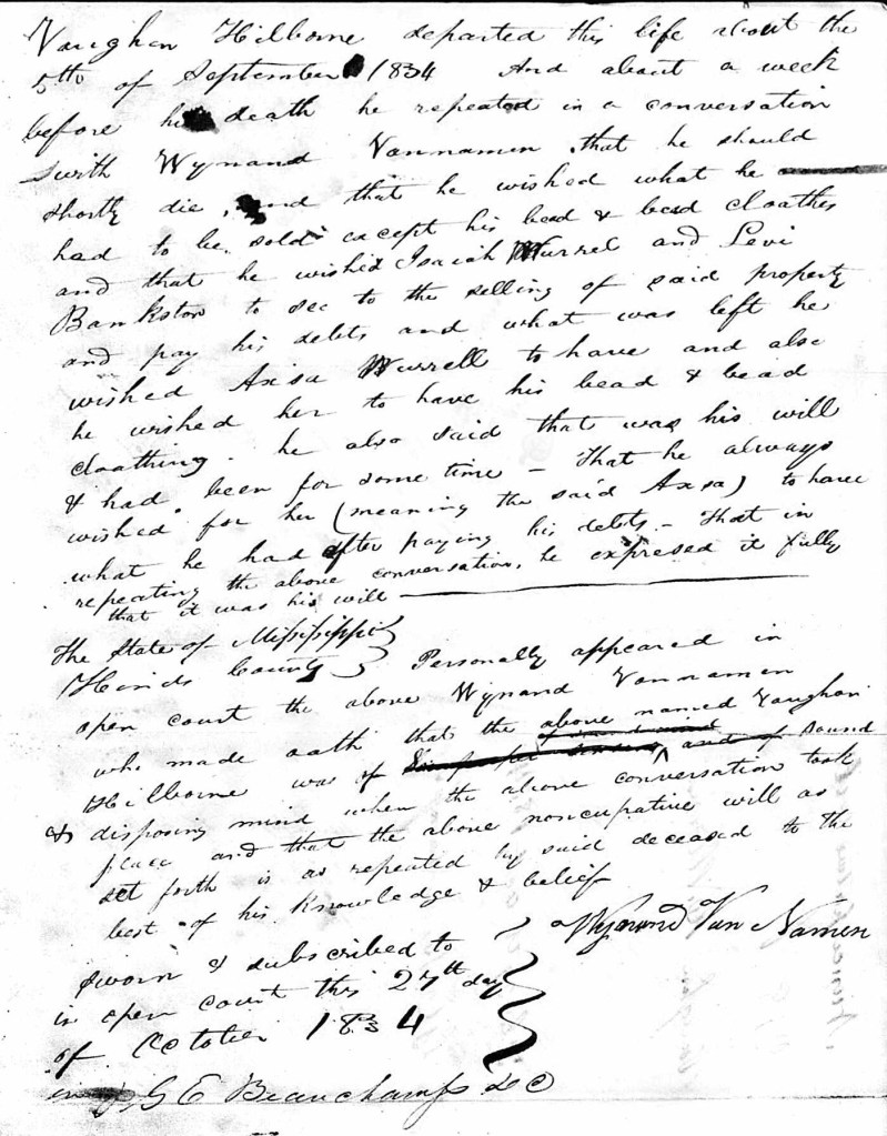 Vaughan Hilborne departed this life about the 5th of September 1834, & about a week before his death he reported (repeated) in a conversation with Wynand Vannamen that he should shortly die and that he wished what he had to be sold except his bed and bed cloaths, and that he wished Isaiah Warner (?) (Worrell) and Levi Bankston to see to the selling of said property and pay his debts and what was left he wished Axsa Waddel (?) (Axey Worrell) to have, and also he wished her to have his bed and bed clothing. He also said that this was his will and had been for some time- that he always wished for her (meaning the said Axey) to have what he had after paying his debts, that in repeating the above conversation he expressed it fully that it was his will. Probated October 27, 1834; Witness: Wynand Van Namen (signature)
