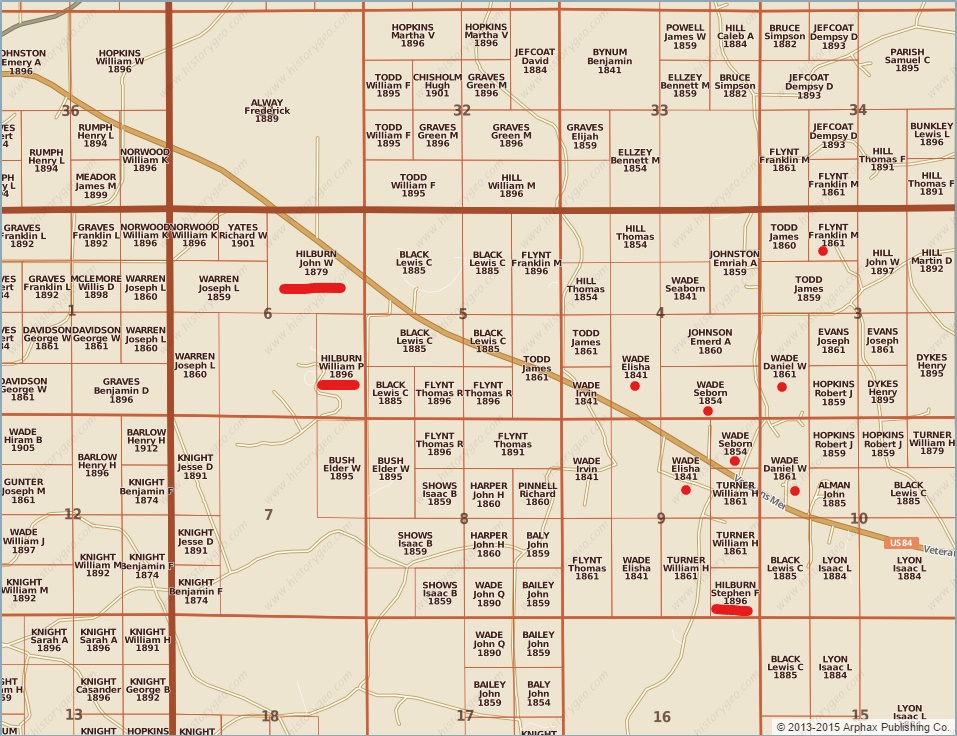 The map below shows land bought by John W. Hilbun, Stephen F. Hilbun, and William P. Hilbun. There are also many familiar names listed near the Hilbuns- many Wades, including Daniel W. Wade’s land is seen northeast of Stephen’s land. Stephen F. Hilbun married Daniel Wade’s daughter, Mary Almedia. North of that in Section 3 is the land of Franklin M. Flynt which is highlighted with a red dot; his land was later bought by Stephen Hilbun. This is the land on which Bruce S. Hilbun raised his family!