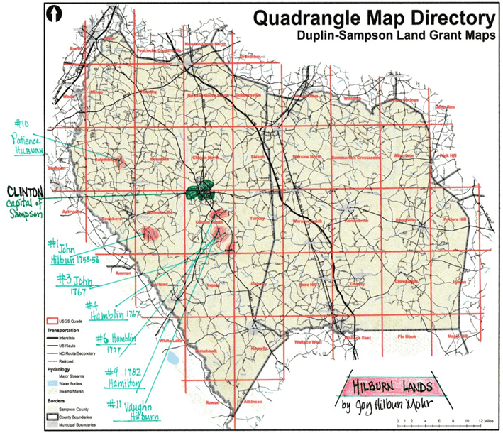 For almost 40 years, from 1755 through 1793, Hilbuns owned land in Duplin County! It is likely that Frederick was born in Duplin. In 1786, the area in Duplin where Hilbuns owned land became part of Sampson County. The Hilbuns who owned land in Duplin /Sampson were John Hilbun, Hamblin Hilburn, Patience Hilburn and Vaughn Hilburn. Two other Hilbuns, Henry Hilburn and William Hilbun, were recorded as witnesses to land records in Duplin.