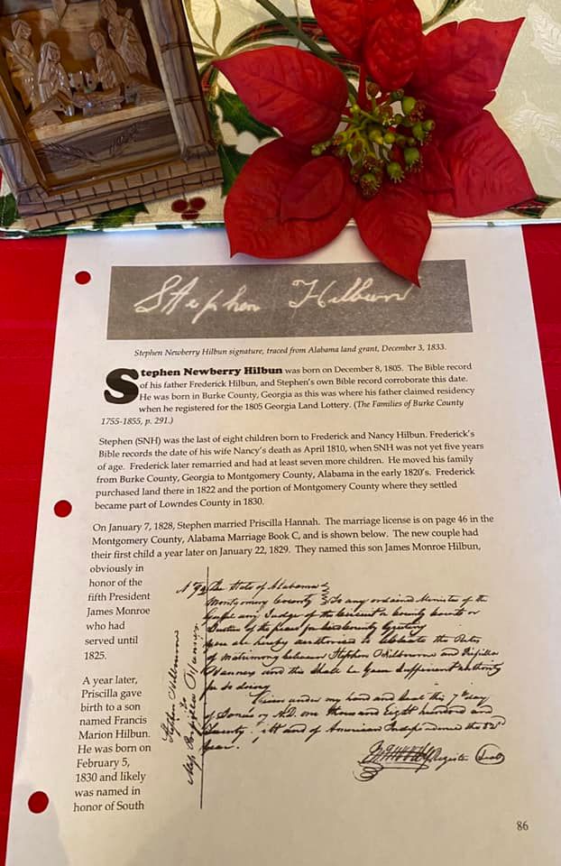 The Hilbuns of Jones County have been traced by records back to Frederick Hilbun, through his son Stephen Newberry Hilbun (SNH) who was born in 1805 in Burke County, Georgia. Frederick Hilbun and family moved to Lowndes County, Alabama by 1820 and most of his sons lived there for years.