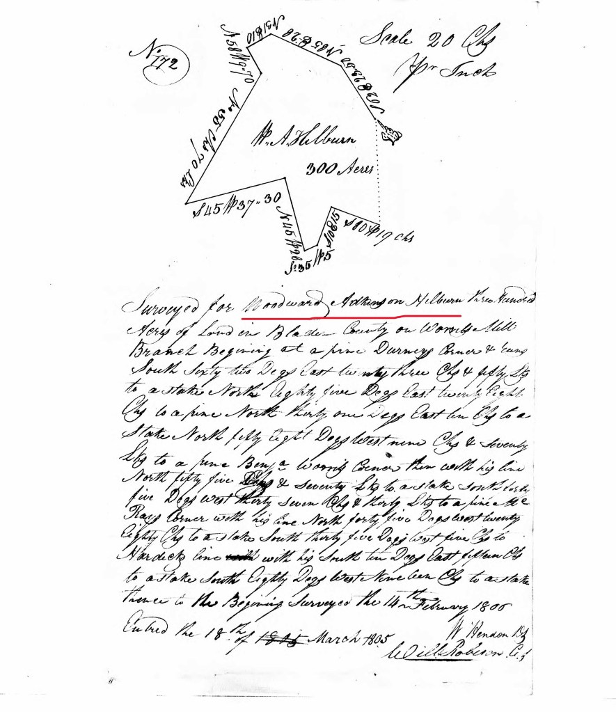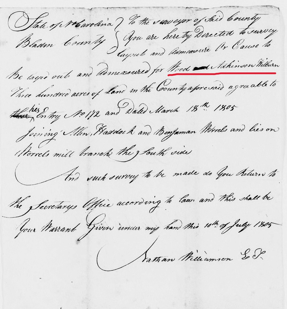 1804. Bladen– Woodward A. Hilburn warrant #1409 issued Jul. 3, 1804 by TW Harvey to Wd. A. “Hillburn” for 640 ac., joins “the” big survey; entered Jan. 7, 1804; 40 ac. surveyed Dec. 13, 1805 by W. Hendon; N Allen & C Tison, chain carriers; (Land on S. Side of the Western Prong, begins at a small black jack on “the” great survey line at fork of Powell Road, joins Bluff Road, & King; 2 copies of survey in shuck). Bladen Co., NC, Land Warrants 1778-1803, AB Pruitt, p. 255.
