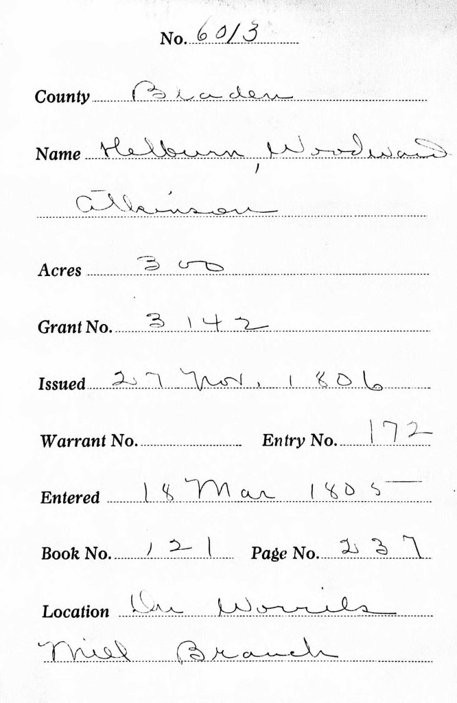 1805 Jul 10. Grant 4763 (6013). Woodward Atkinson Hilburn– 300 acres issued Jul 10 1805 by Nathan Williamson to “Wood” Adkinson “Hilburn” for 300, joins James Allen Haddock & Benjamin Worrel & on by ….W. Hendon on WORRELS Mill on the south side, entry……on Worrels Mill Bridge border; begins at …& Wiley Braddy, chain carriers. Nov 18, 1806, Wood…. #172 (signed. ). J. Craven, comptroller, grant #3143? Issued…..
